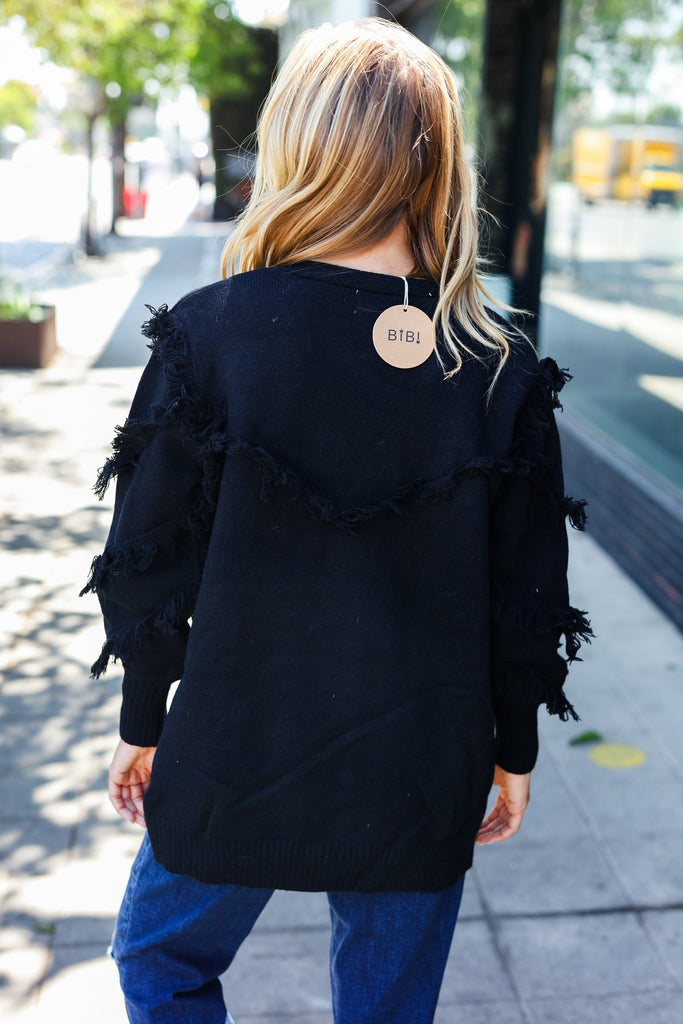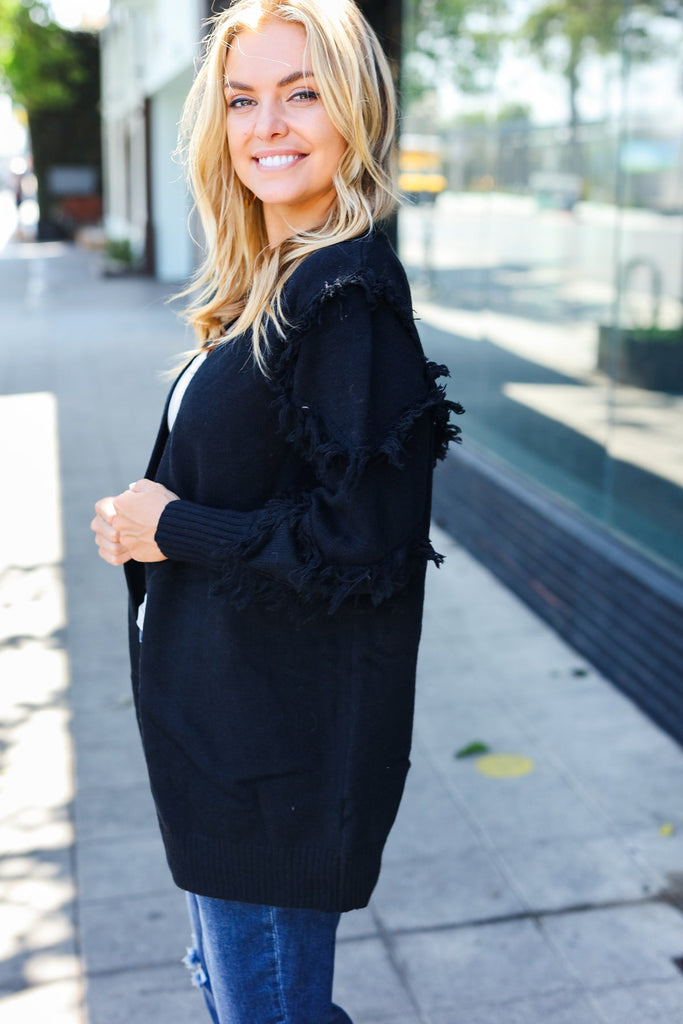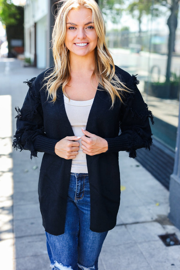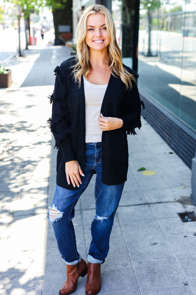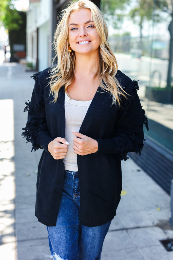 Punctuate your casual look with this stunning cardigan in a beautiful heavy weight knit with fringe detail down the sleeves and across the back. The ribbed sleeves and hem complete this cozy cardigan.
