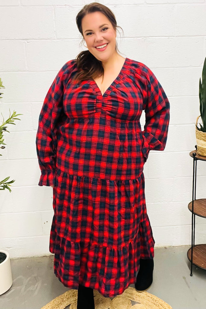 All I Want Red Plaid Elastic V Neck Tiered Maxi Dress