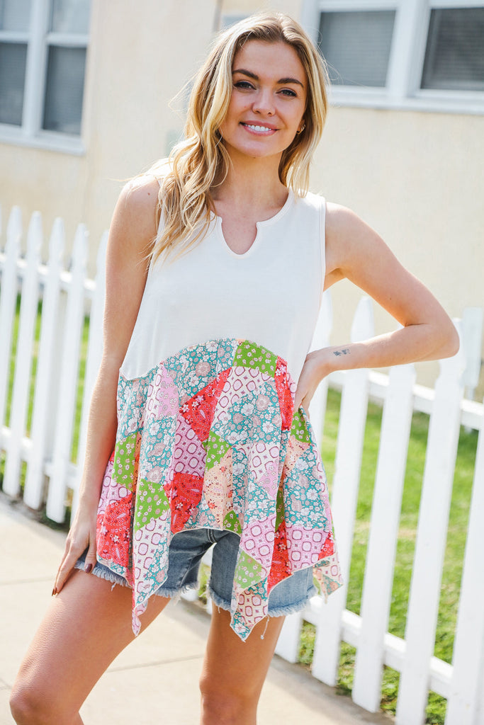 Bring on sun, sandals and all-things-feminine with this terry notched neck sleeveless top featuring a patchwork print and shark bite hemline. Step into summer with confidence in this color block, flattering style!